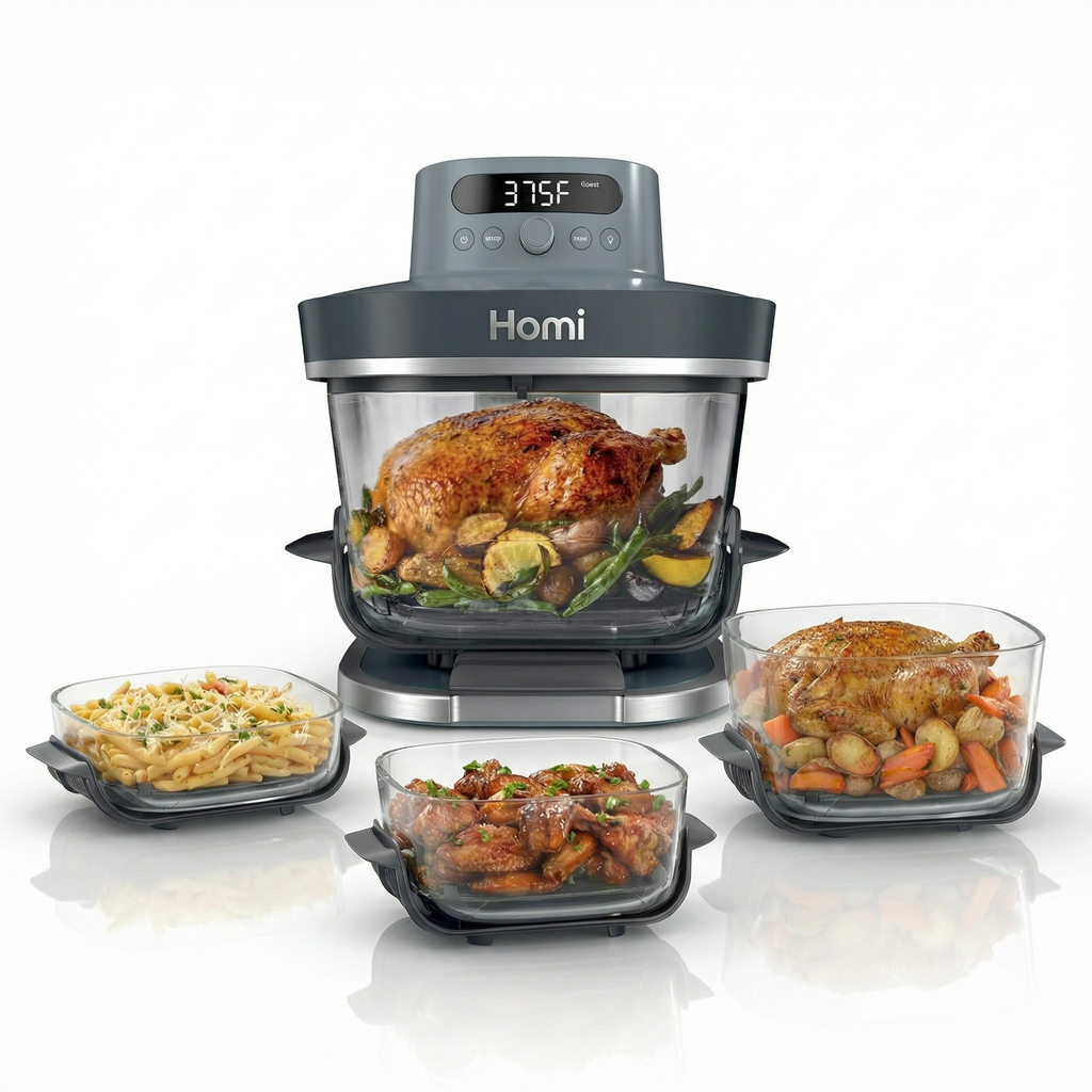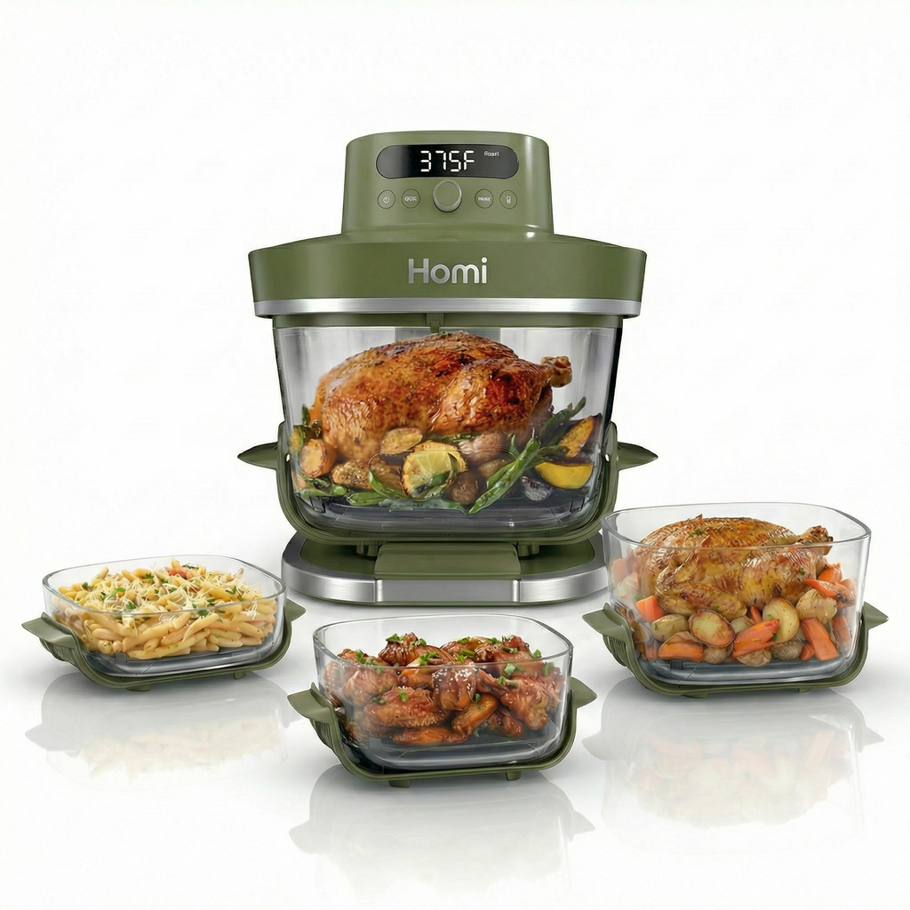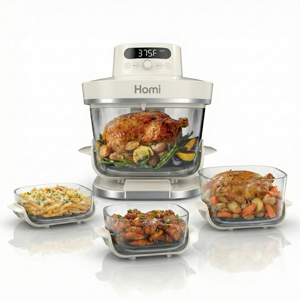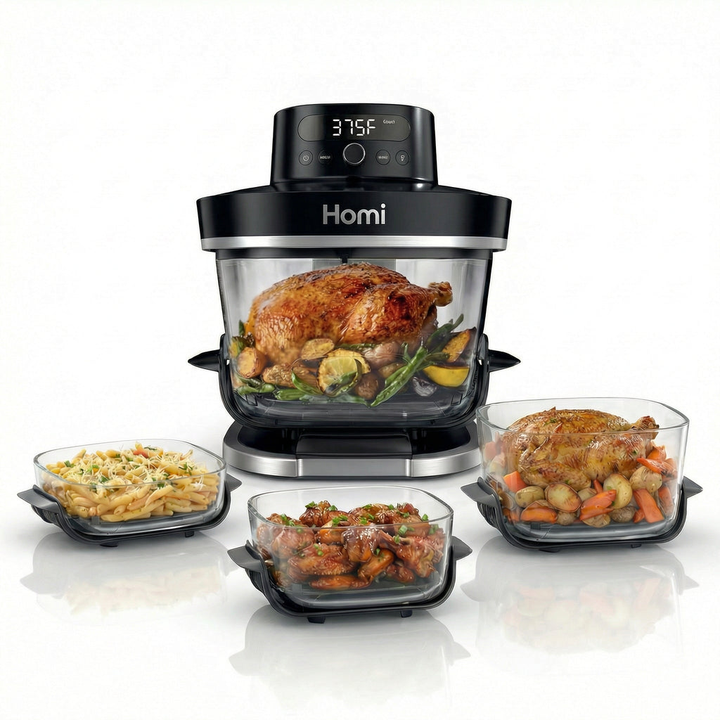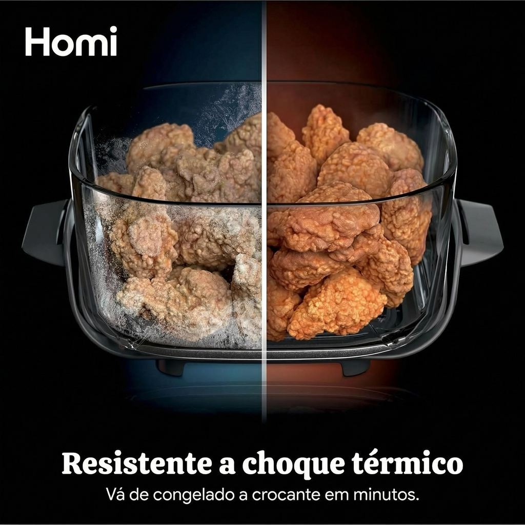Redefina sua cozinha com a Homi Crispi Pro, um sistema de cozimento revolucionário totalmente em vidro. Equipado com uma potência de 1800W, este aparelho não é apenas uma Air Fryer: é uma solução completa que permite cozinhar, servir e armazenar no mesmo recipiente. Graças ao vidro CleanCrisp™ resistente a choques térmicos, você tem visibilidade total do preparo e a garantia de uma alimentação livre de toxinas.