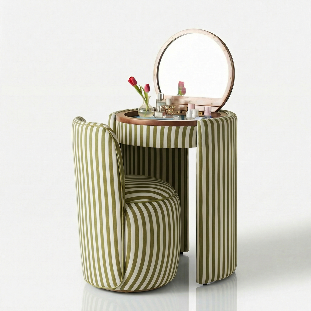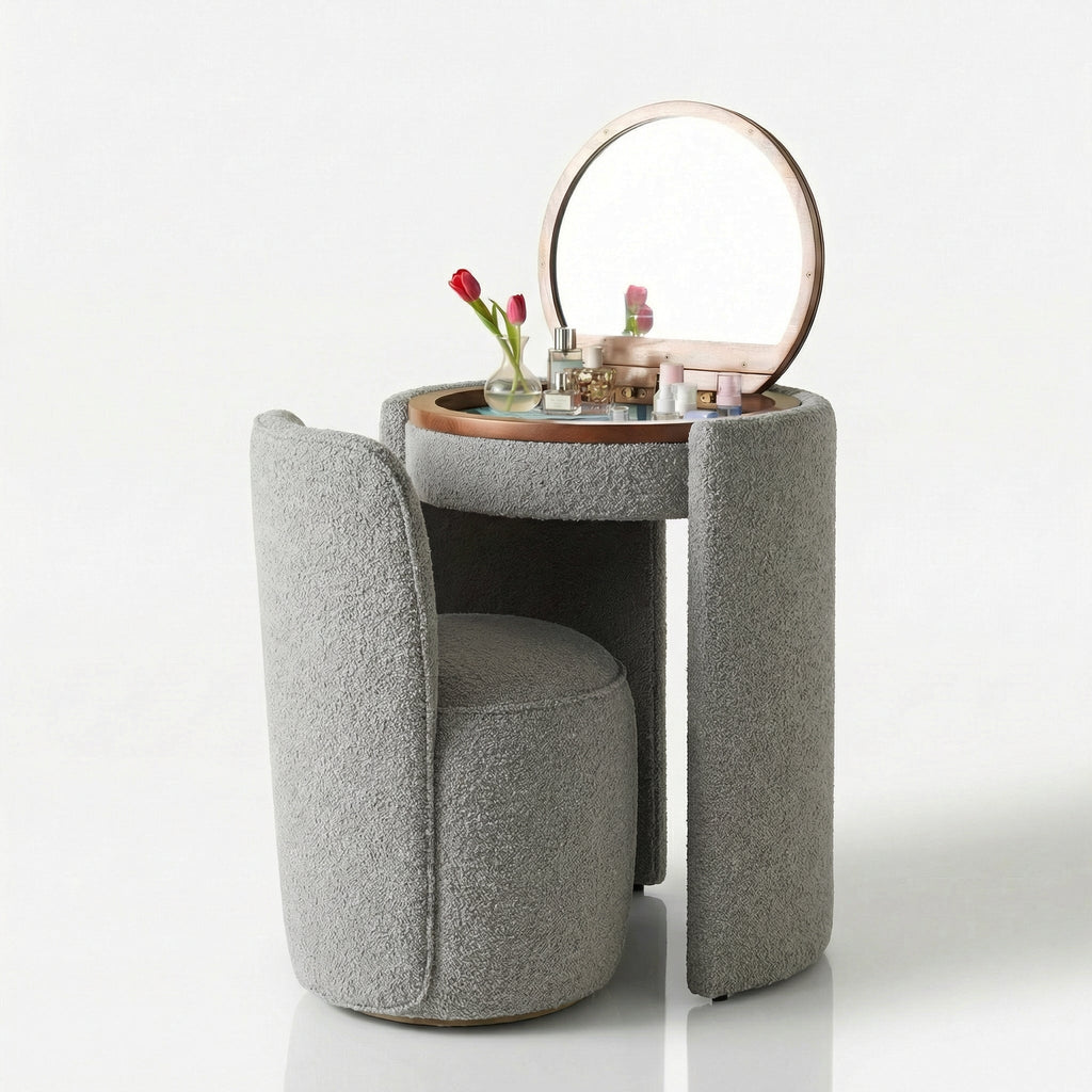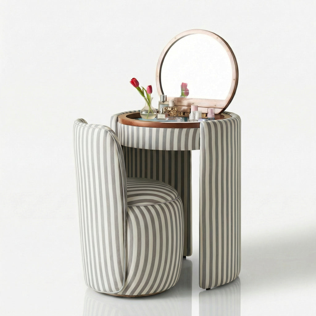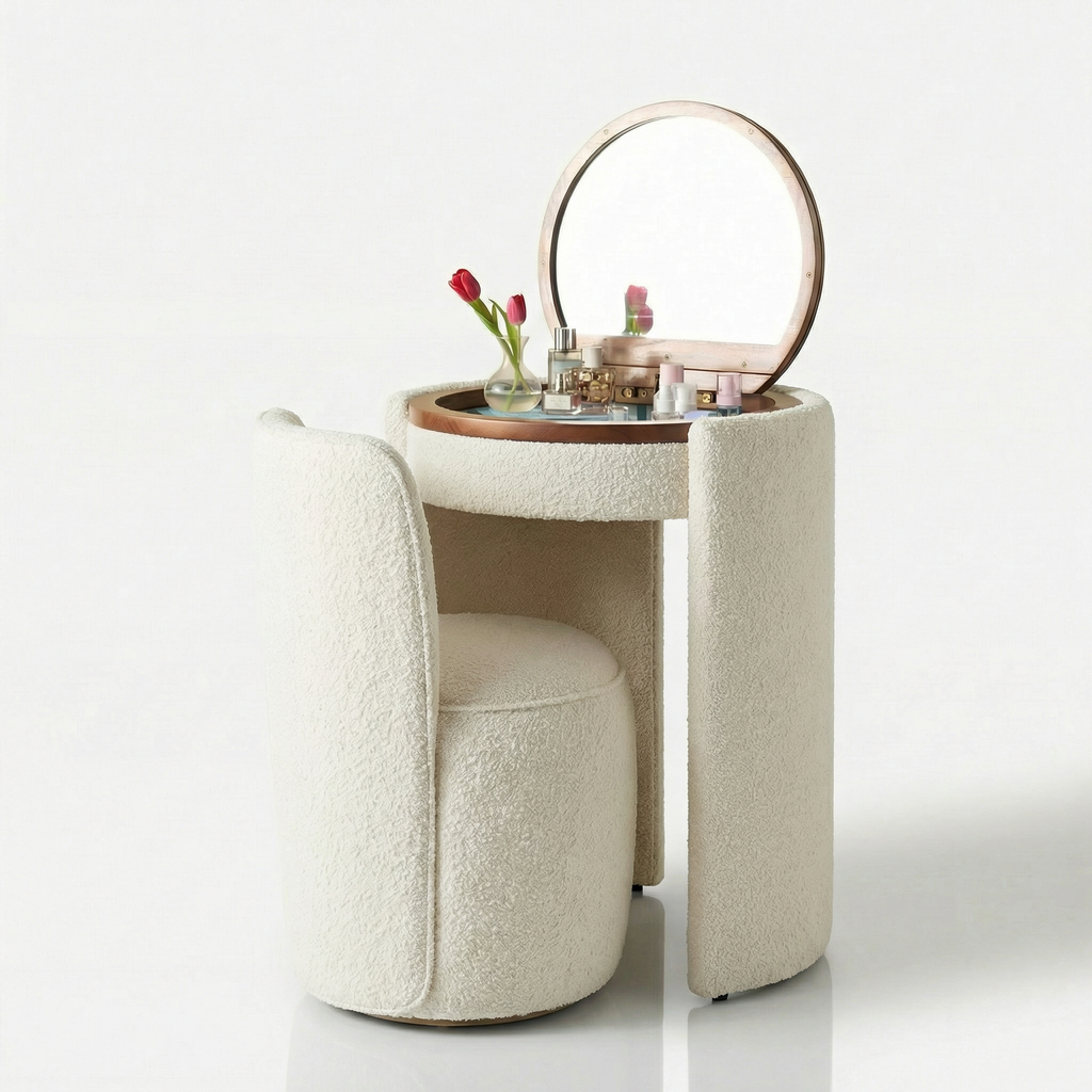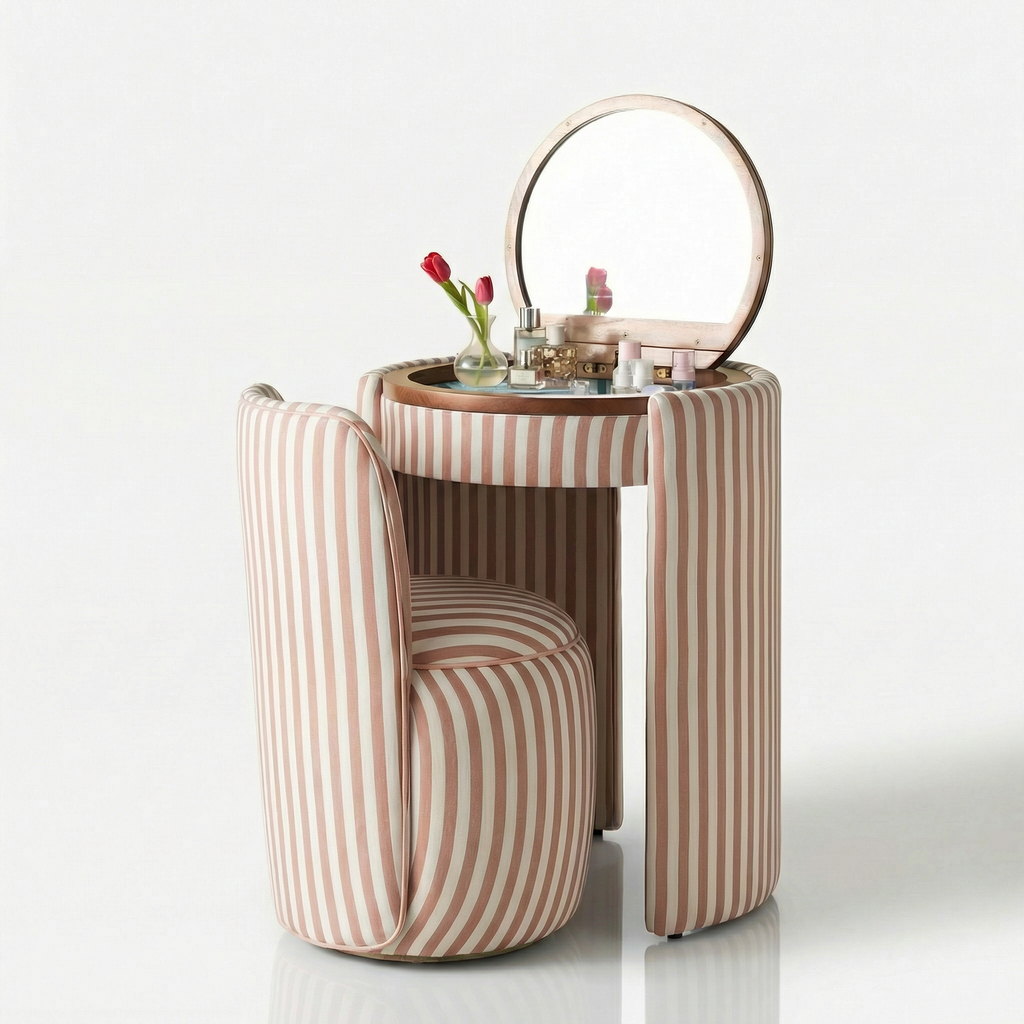 Perfeita para espaços compactos que não abrem mão do luxo, esta penteadeira redefine a organização. Seu design cilíndrico inovador permite que a banqueta se encaixe perfeitamente sob a mesa quando não está em uso, formando uma peça única e escultural. Com acabamento em tecidos nobres (Linho ou Bouclé) e detalhes em madeira natural, ela possui um tampo elevatório que revela um espelho e compartimentos secretos para suas joias e maquiagens.