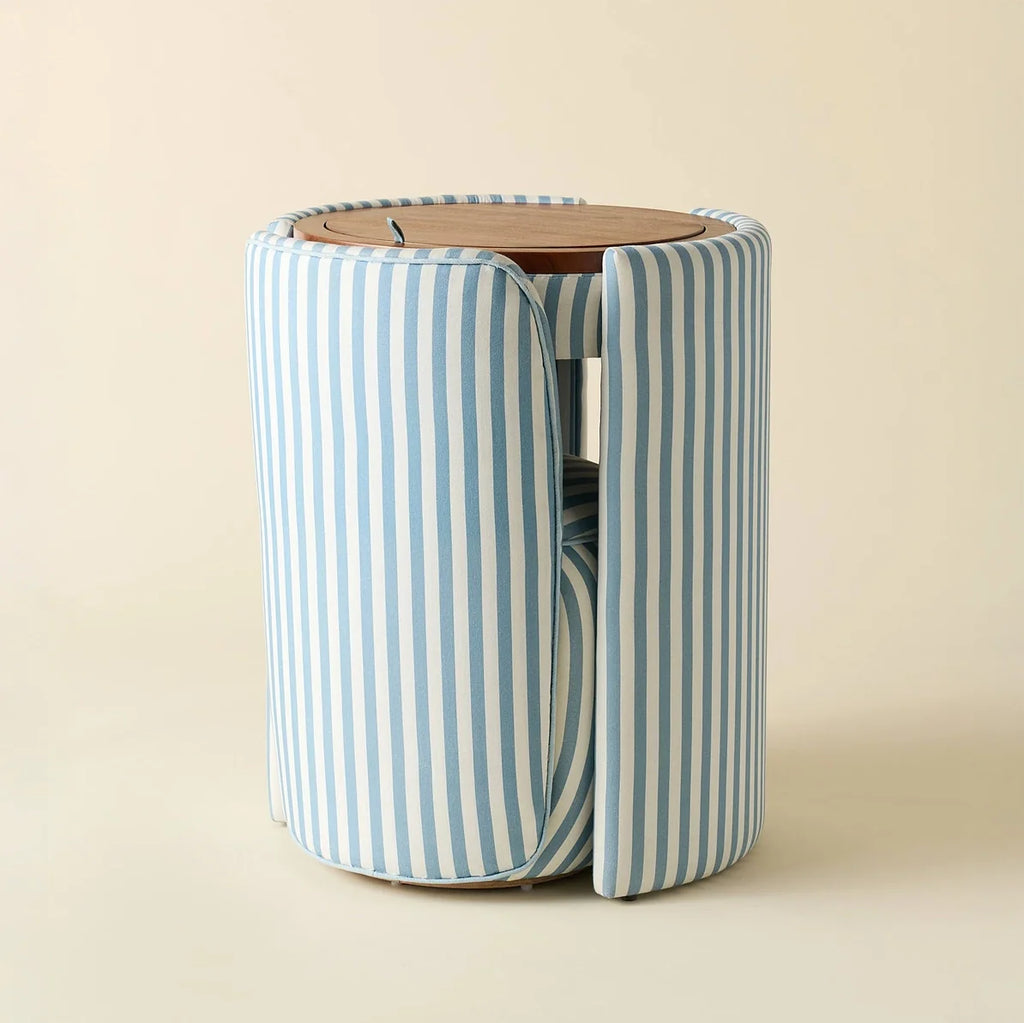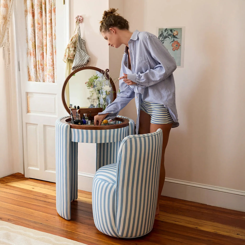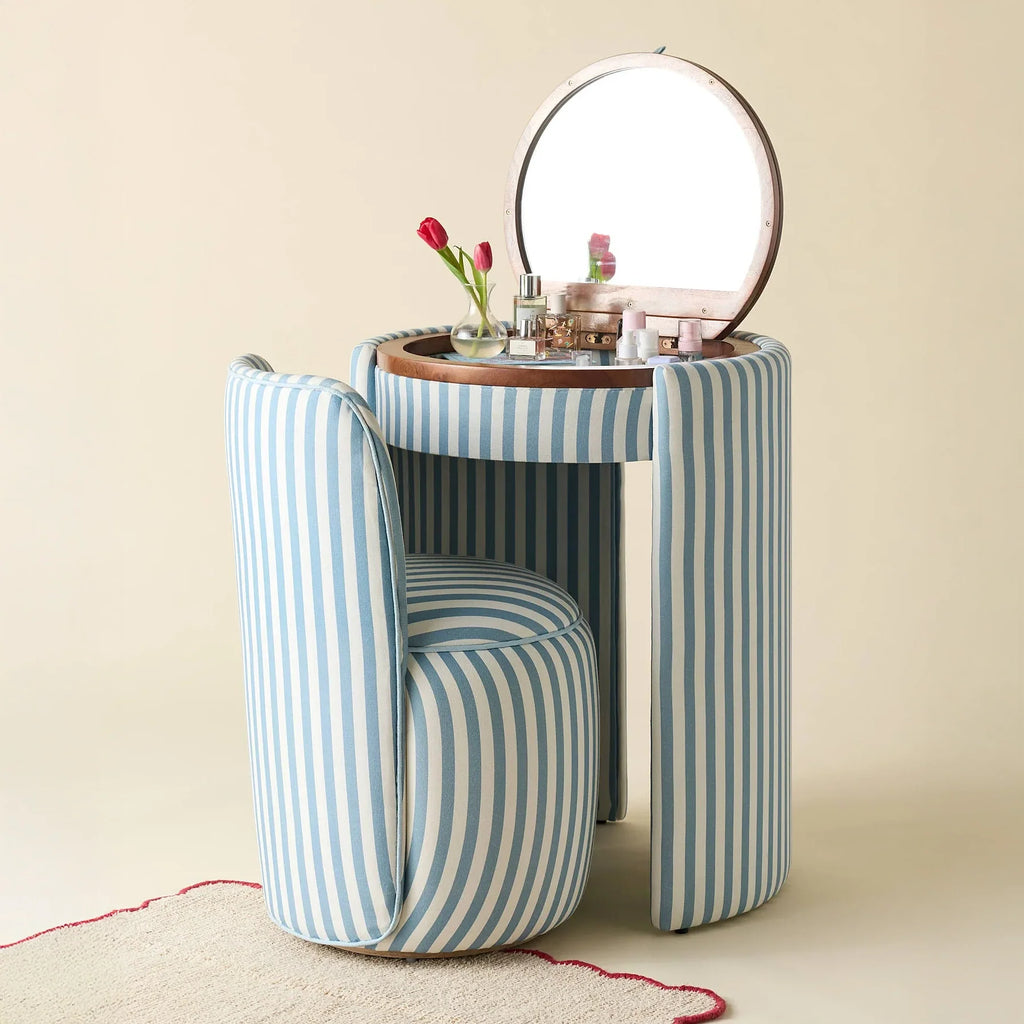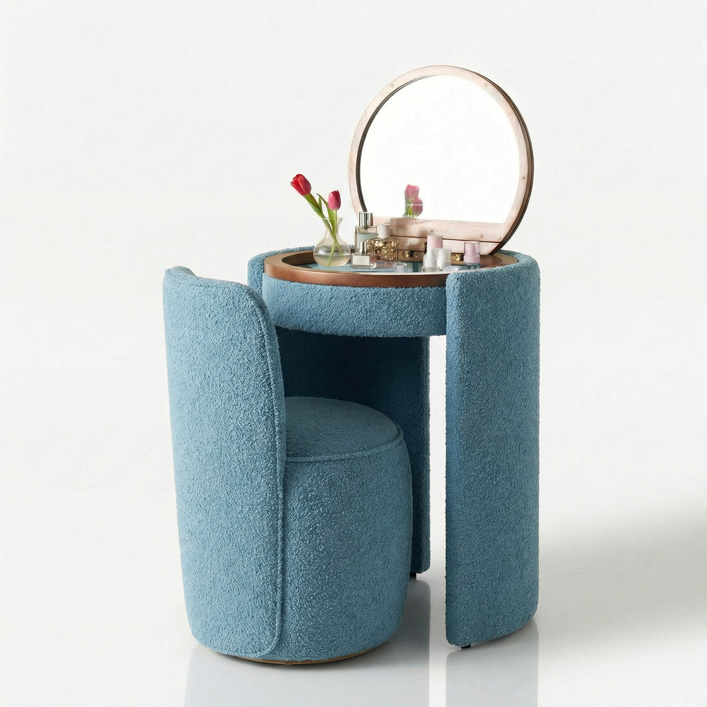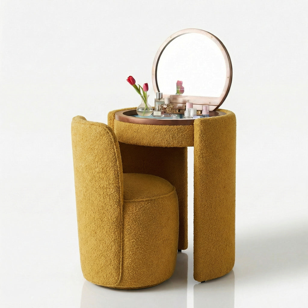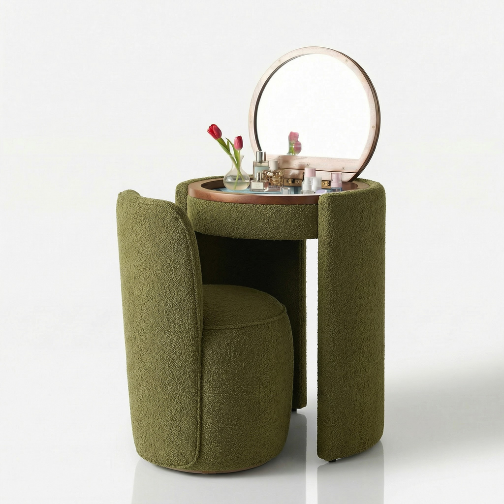 Perfeita para espaços compactos que não abrem mão do luxo, esta penteadeira redefine a organização. Seu design cilíndrico inovador permite que a banqueta se encaixe perfeitamente sob a mesa quando não está em uso, formando uma peça única e escultural. Com acabamento em tecidos nobres (Linho ou Bouclé) e detalhes em madeira natural, ela possui um tampo elevatório que revela um espelho e compartimentos secretos para suas joias e maquiagens.