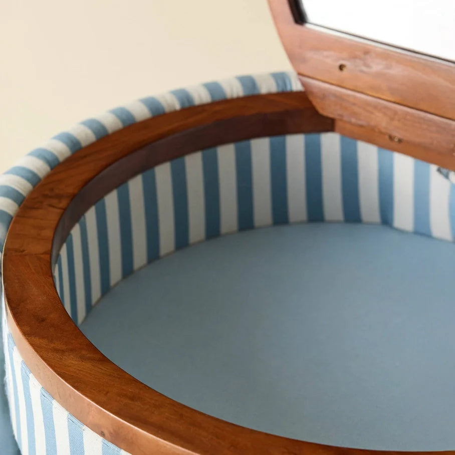Basta levantar o tampo de madeira para transformar a mesa em um camarim pessoal. O espelho integrado possui o ângulo ideal para maquiagem, enquanto o interior oferece armazenamento aveludado para proteger seus itens preciosos.